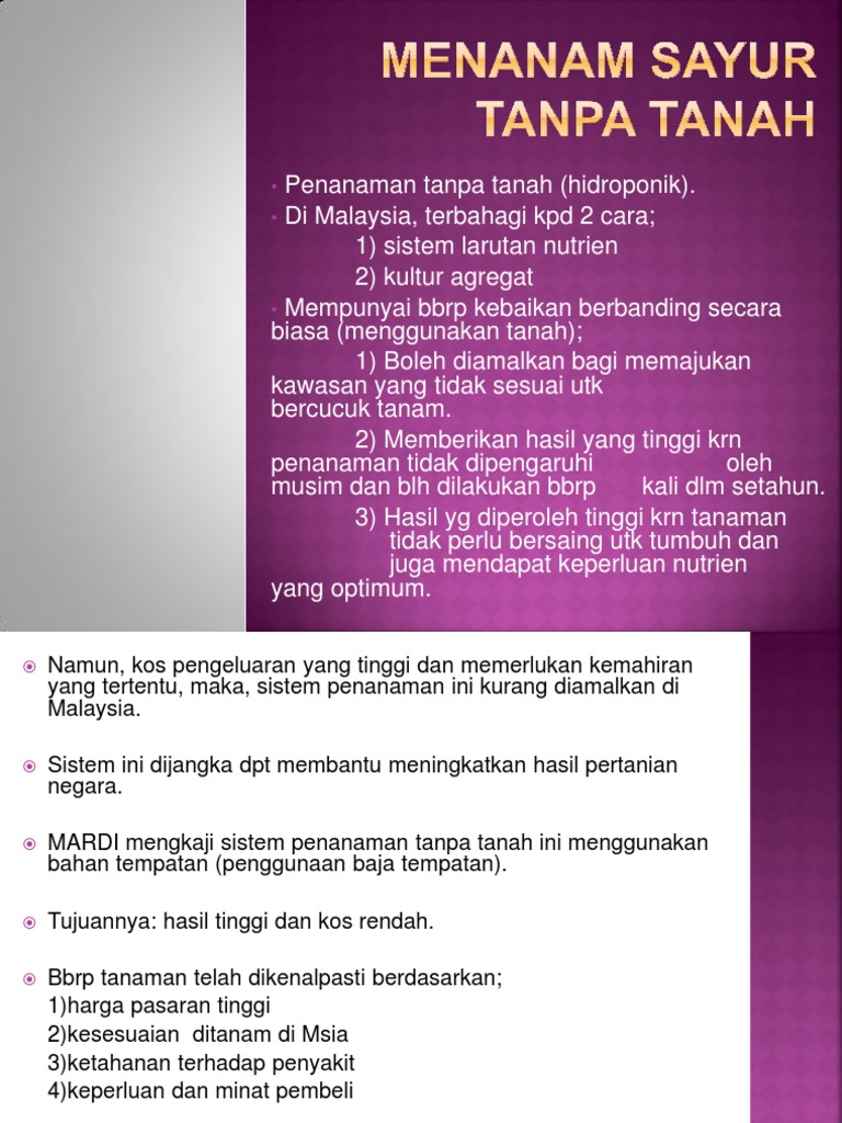 Hidroponik ialah satu kaedah penanaman sayur-sayuran yang tidak menggunakan tanah. Bahagian 4 Sistem Hidroponik. WF Gericke dari Universitas California Amerika Serikat pertama kali memperkenalkan cara bercocok tanam.